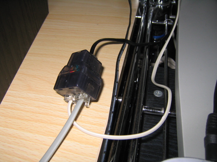 〈ポイント〉下から2番目がモデムポートです。ここに2分岐アダプタから白いモジュラケーブルを差し込みます。現在は、ADSL回線や光回線を使用している場合が多いのでこのモデムポートをインターネットに使用する人は少ないと思います。ノドボトケもADSLなので今までこのポートは使っていませんでした。