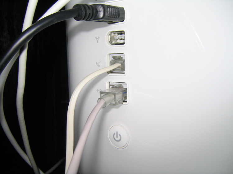 白いモジュラケーブルは、iMacのモデムポートへ接続し、グレーのモジュラケーブルは、電話機に接続します。
