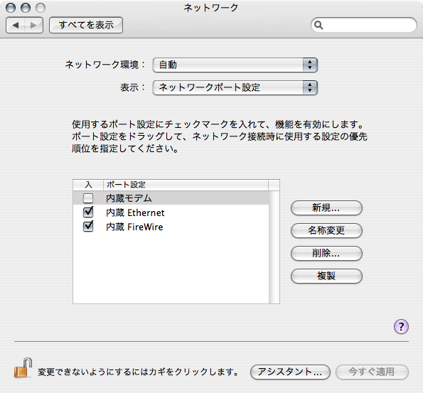 「システム環境設定」→「ネットワーク」をクリック、表示のポップアップメニューから「ネットワークポート設定」を選択し、内蔵モデムのチェックを外しておきます。これでモデムポートがインターネット用として使用されることはありません。