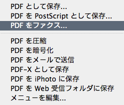 「ファイル」メニューから「プリント」を選択します。プリントダイアログが表示されます。次に「PDF▼」をクリックしメニューから「PDFをファクス…」を選択します。