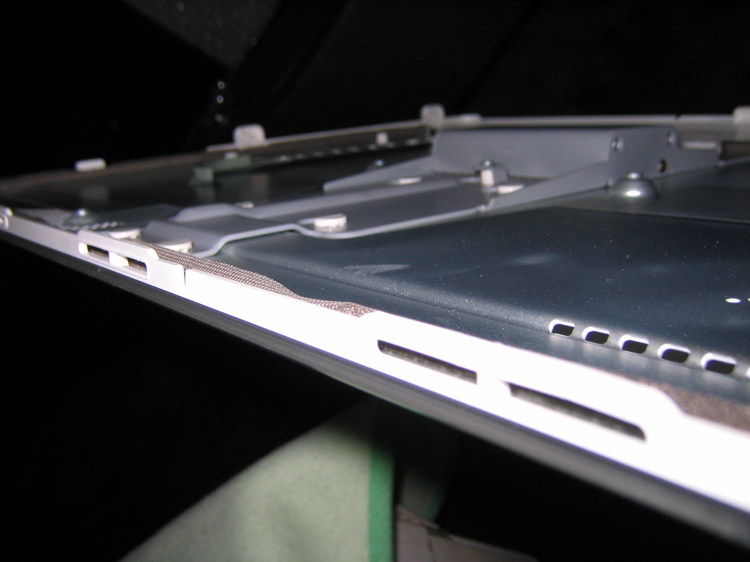 〈注意点〉上端のスロットとタブはなかなか合わさりませんでしたが、根気よく調整しながら取り組んでいたらスルッとはまりました。無理にねじ込まないようにじっくりと取り組んでください。上部が収まったら背面カバーを下に降ろし、コンピュータにぴったりと収まるまでゆっくり押します。背面カバーがはまったら、底面の3つのネジを回して、締め付けます。締めすぎてねじ山をつぶさないように気をつけてください。