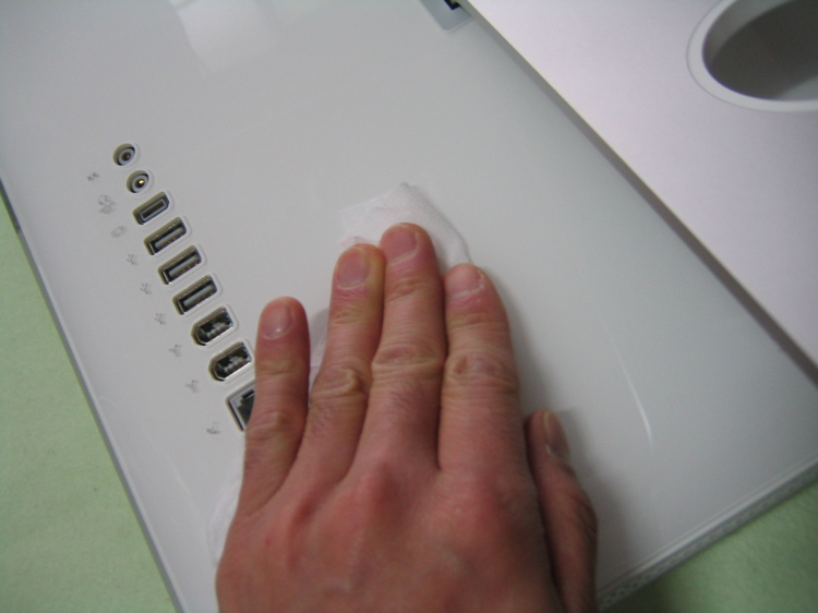 パソコンまわりをウェットティッシュでクリーニング(適時すればいいと思います)したら、コンピュータの両方の側面を持って、ゆっくり起こし、元の場所に置いて外しておいたケーブルと電源コードを接続します。コンピュータの背面にあるパワーボタンを押して、電源を入れます。