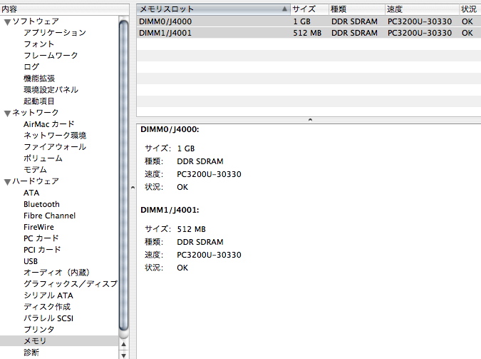 「このMacについて」の〔詳しい情報...〕をクリックし、「システムプロファイラ」を開き、メモリの内訳について確認します。