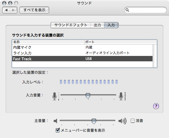 4.「入力」をクリックし[サウンドを入力する装置の選択リスト]の中からFASTTRACKを選択します。この際、入力音量を最大に近づけておくとよいでしょう。